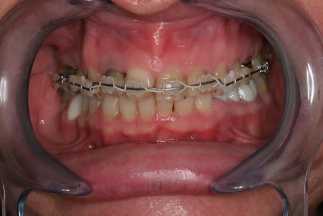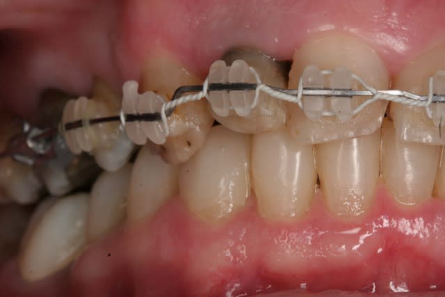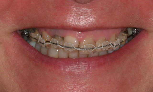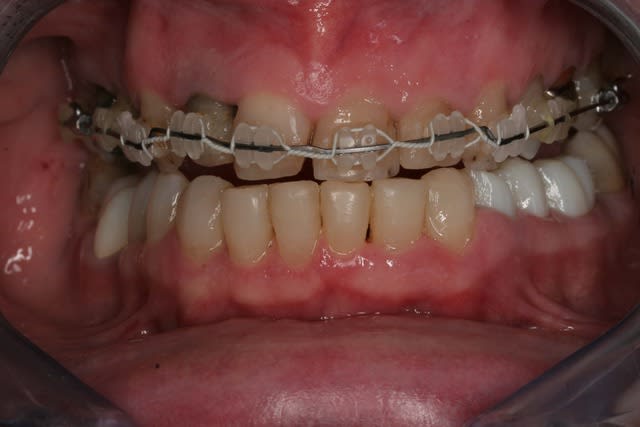 Gingivectomie légère à la fraise à biseau pour harmoniser les collets, mais l'ortho a permis d'énormément faciliter ce travail.