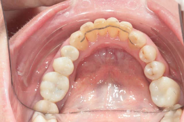 Si bien sûr, sur les photos le bas venait juste d'être déposé, pour le montage composite, la patiente retournait le lendemain chez l'ortho pour placer une contention (celles que je fais avec l'Everstik me semble moins costaud que les siennes avec un fil titane), on devine un peu les faces vestibulaires des inf sur les photos pstés précédement, elles ont un sorte de crevace les striant de mesial à distal à mi hauteur, avec des petits trous colorés brun , mais pas de lésion carieuse ni de restauration ancienne. Le haut devait être déposé dans la foulé mais l'axe mésio-distal des 11 et 21 était trop couché et c'est moche (effet d'essuie glace) donc le multibague haut est resté quelques semaines de plus, d'où les photos mixte soins bas ortho haut.