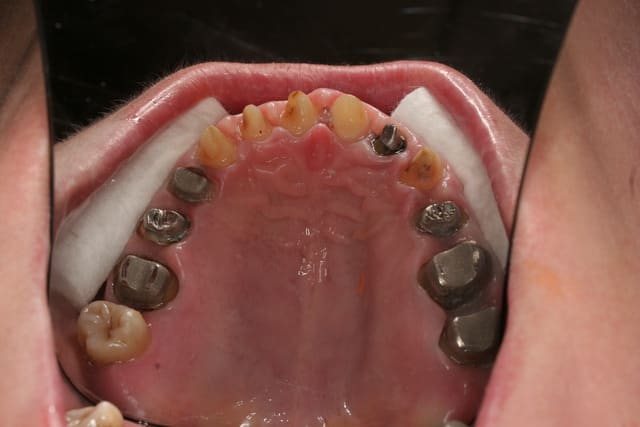 Préparation des molaires pour permettre des RTE sous digue à travers les provisoires, retrait des anciennes couronnes et ancrages sur les 12, 15 et 25 endo satisfaisantes (couronnes ayant plus de 30 ans pour certaines!!!.