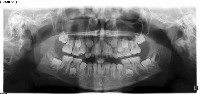 Il faut regarder les 6 du haut, surtout la 26. En bas, les dents sont nécrosées, le développement s'est arrêté.