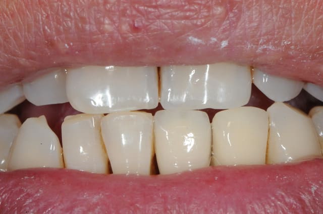 sur la photo (sur la photo uniquement) on devine un aspect de surface très légèrement granuleux parrapport à celui des dents voisines.