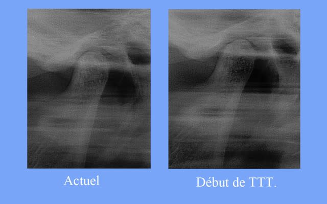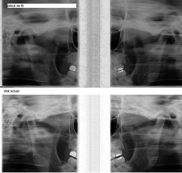 En fait en observant le montage des 2 radios (merci Jeff pour l'avoir montré), je ne vois pas vraiment de différence au niveau de la position des condyles, par contre avant la radio est prise avec des dents en inoclusion et après en occlusion, on peut donc imaginer que si la radio avait été prise au départ en occlusion on aurait pu voir des condyles remonter et/ou reculer et comprimer alors ménisque et zone bilaminaire . Attention on est au conditionnel, est donc la radio ne prouve rien, et ça je pense que tout les passager du A380 l'ont vu.