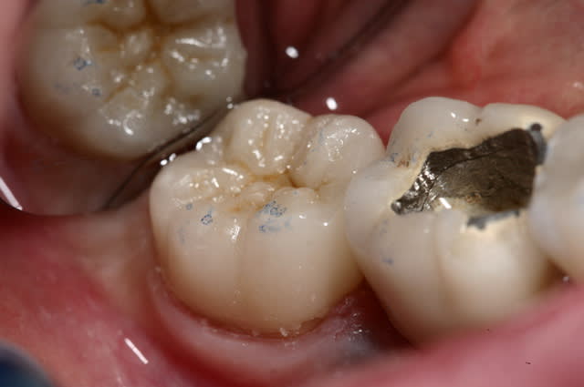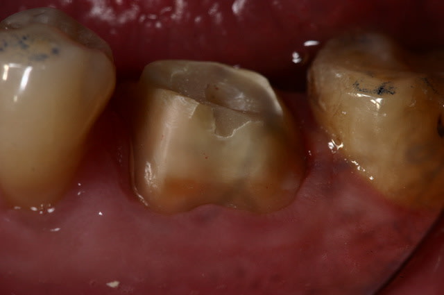@ Steph : Sur un délabrement tel que celui de la photo présentée, on peut envisager que la tendreté de l'onlay composite amortit et absorbe les forces et préserve ce qu'il reste de cette molaire alors que ce ne sera pas le cas avec l'onlay céramique.