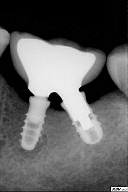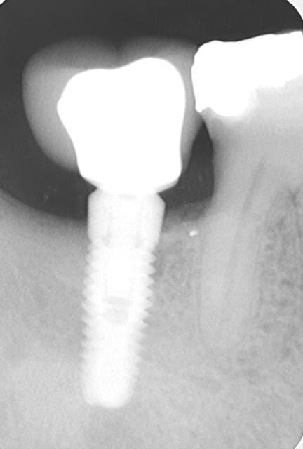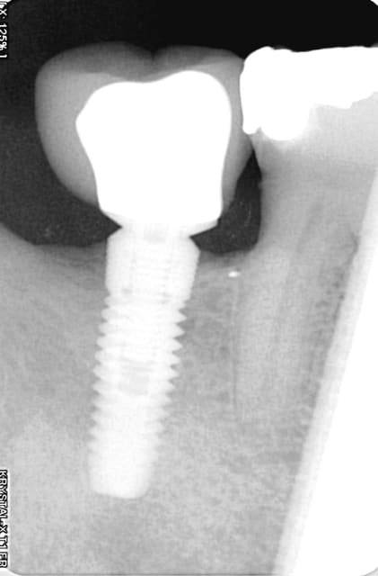 Voici 2 clichés radiologiques qui peuvent paraître surprenants (ici c'est un implant easyimplant à connexion type astra), le premier en juillet 2009 le jour de la pose de la couronne et le deuxième ce mois d'août 2011 (certes vous êtes obligé de me croire, mais ce n'est pas la première fois que j'observe ce phénomène). Ici, le patient procède à un contrôle de plaque parfait.