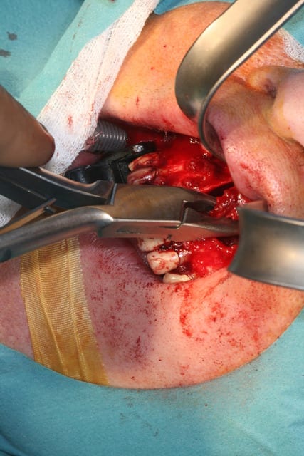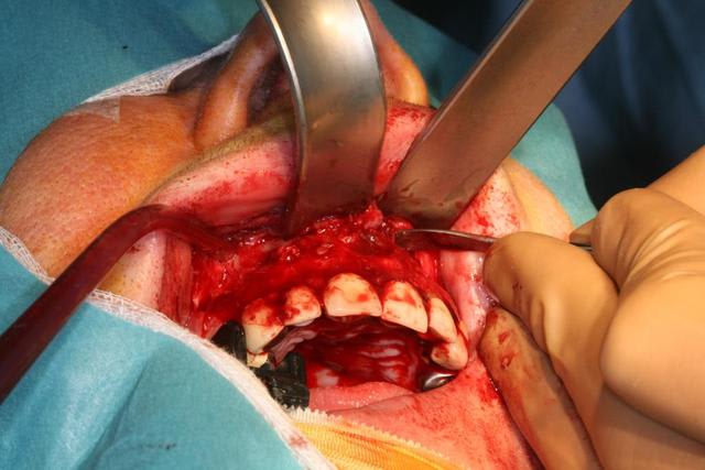 Dans un premier temps j'ai disséqué le kyste qui a détruit le plancher des fosses nasales et le mur palatin.