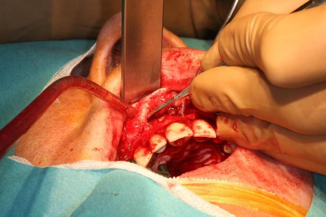 Dans un premier temps j'ai disséqué le kyste qui a détruit le plancher des fosses nasales et le mur palatin.
