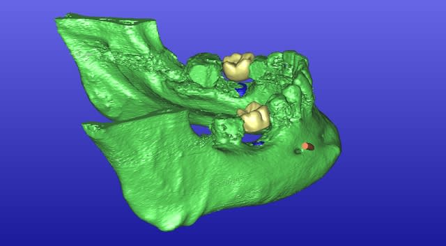 peut-tu nous montrer une modélisation 3D de la crête osseuse et de l'implant pout voir le niveau repaire que tu vas utiliser pour le forage