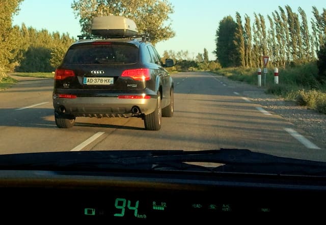 Ceci dit, hier soir j'ai suivi le Q7 avec malle de toit pour observer son comportement à allure soutenue ainsi chargé. Il se dandine comme un Kangoo...