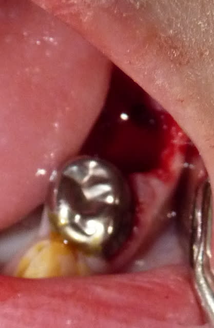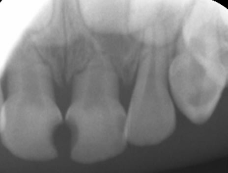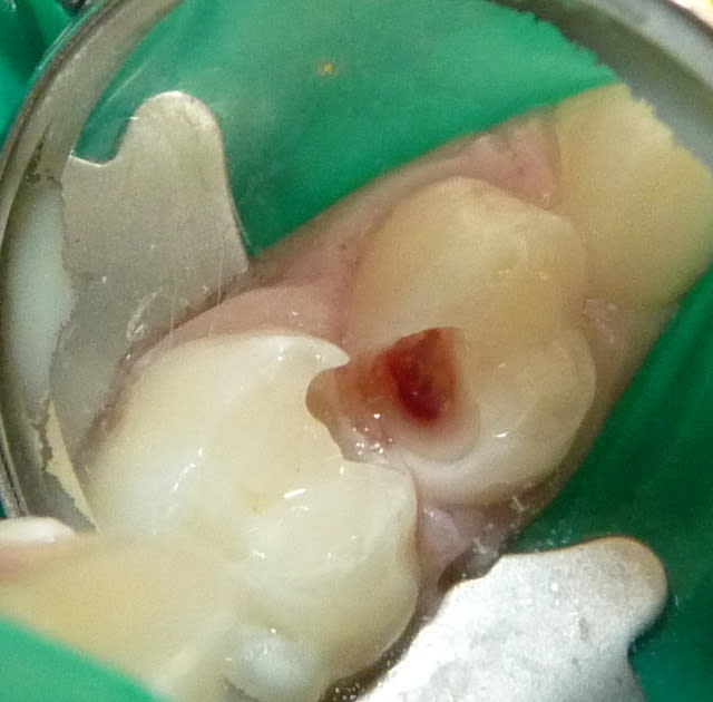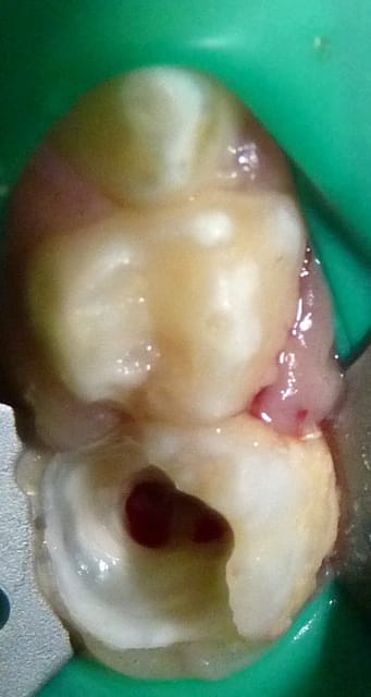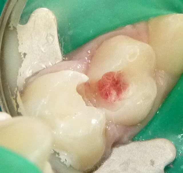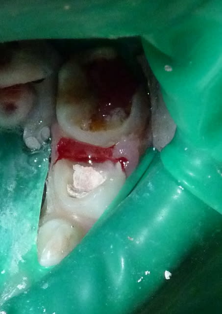 - La pulpe radiculaire était également infectée. On s'en aperçoit cliniquement après éviction de la pulpe camérale : les moignons pulpaires radiculaires sont soit gris et sans saignement (nécrose), soit avec un saignement très abondant qui n'est pas arrêté par compression (pulpite).