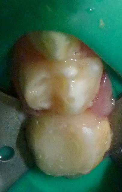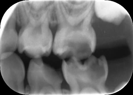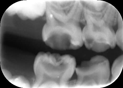 Dans le cas ci-dessous, la 1ère photo est prise après début d’éviction carieuse : sur la 4, on voit déjà la pulpe par transparence. Les tubuli dentinaires d'une dent temporaire sont beaucoup plus larges et nombreux que sur une dent permanente. Ainsi, une carie dentinaire infecte très rapidement la pulpe camérale. Faire une restauration sans pulpotomie dans ce cas aurait probablement abouti à une nécrose à moyen terme.