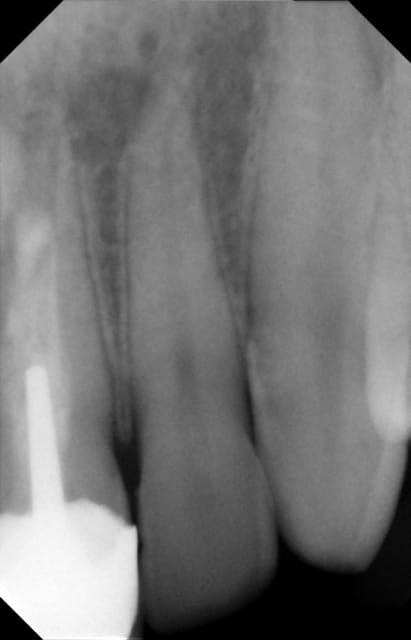 Monsieur R se présente en consultation avec pour motif douleur au niveau apical de 21 22. Adolescent il avait subi un trauma sur 21 qui avait été dévitalisée et couronnée.