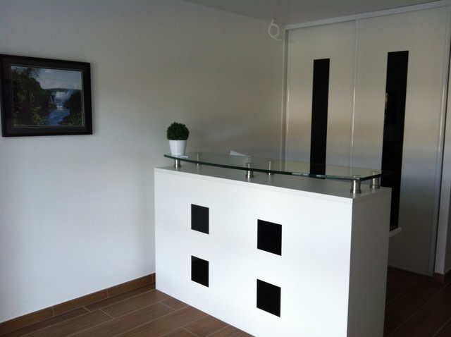 pour la banque d'accueil c'est aussi un artisan du village qui m'a fait tous les placards et la banque ( il passe par un constructeur sur mesure je ne sais ou ) .