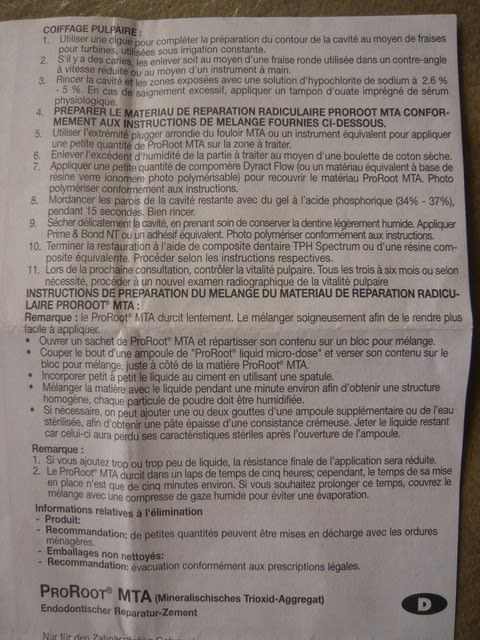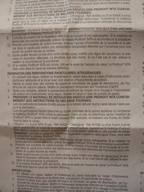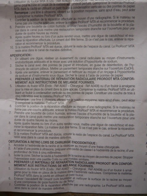 ProRoot MTA Dentsply le mode d'emploi dans la boite.