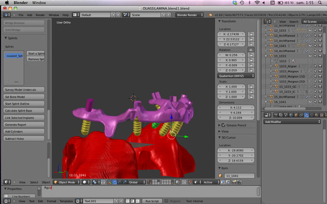 Néophyte sur le site , je suis actuellement interne en 3ème année en Chirurgie orale à Dijon et je suis actuellement en cours de prospection pour mon sujet de thèse. Après de longues discussion avec mon PU-PH , je compte m'orienter sur la thématique de la planification implantaire et de la réalisation de guides chirurgicaux à l'aide d'imprimante 3D. Notre service est équipé d'une Makerbot Replicator 2 , avec Blender et l'employons à l'heure actuelle exclusivement en traumatologie maxillo-faciale (conformation de plaques d'ostéosynthèses , simulation pré-chirurgicale dans le cadre des typo-hypercondylies....etc). Mais je souhaiterai approfondir son utilisation en chirurgie pré-implantaire.