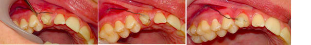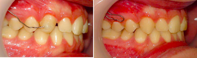 Au bout de quelques temps le fil NiTi est supprimé, une cale en composite est réalisée sur la couronne de 13 pour permettre d'y accrocher le CT8-1, lui-même déplié et orienté vers le bas pour exercer une force égressive. L'inflammation gingivale autour de 13 va disparaître rapidement dès le retour au brossage correct. Noter qu'à la fin du mouvement, le CT8 n'est pas déformé, il a gardé l'activation qui lui avait été donnée.