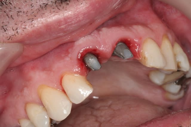 La différence visuelle en photo est l'inflammation gingivale(je pense du au contraste) qui ne se résorbera que lors de la totale élimination des particules non ostéo intégré ou d'une étanchéité meilleure de la vis.