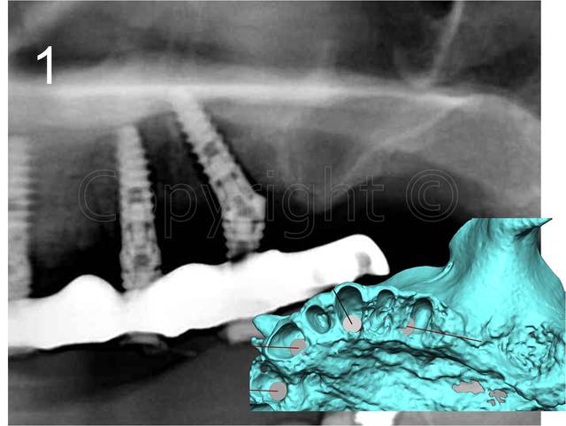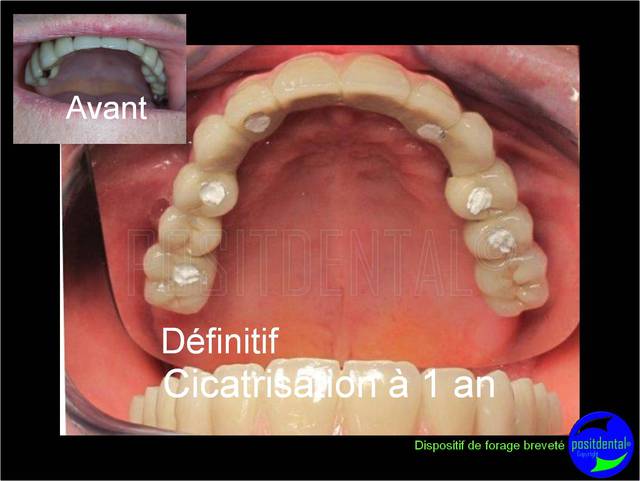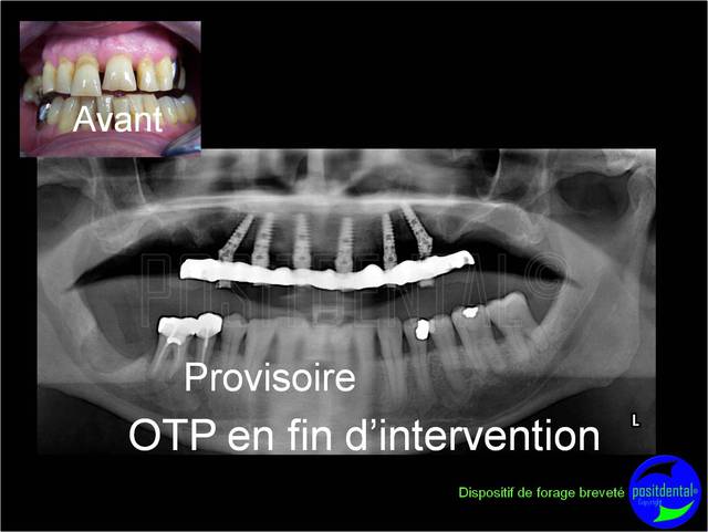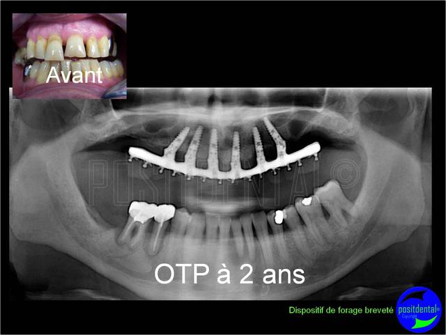 Merci olivier de souligner qu’il est difficile d’apprécier sur les OTP présentées l’ostéointégration, le patient est régulièrement suivi et les tests ont été pratiqués avant la pose du définitif, dans les 5 ans un scanner est programmé afin contrôler le remodelage osseux et finaliser l’étude préliminaire en cour.