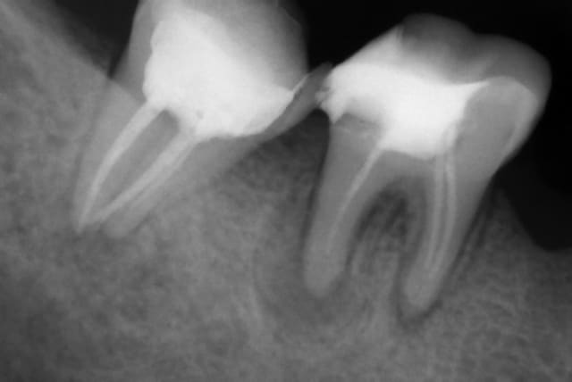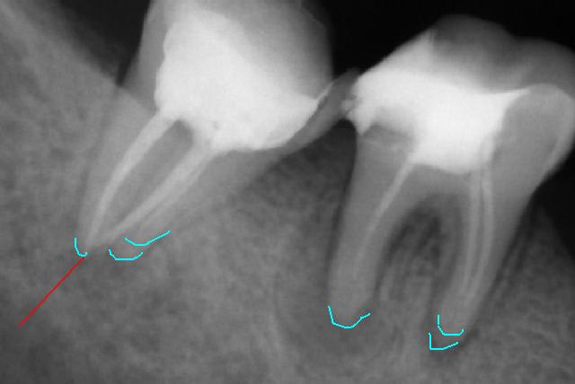 J'ai désobturé le canal ML et j'y ai mis de l'hydroxyde de calcium.