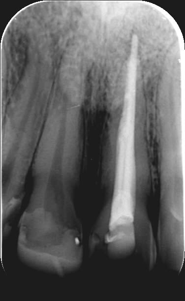 J’aurais aimé pouvoir compter sur quelques tests pulpaires au préalable ( sur la canine et sur la latérale), mais, à vue d’œil , en admettant que les deux dents ne répondaient ni au test thermique ni au vitalomètre, il y a possibilité que ce soit peut être une nécrose au niveau de la latérale, de la canine (j’en doute) et un kyste fissuraire latéral concomitant. Ne le penses tu pas? Le site pour un tel kyste est le bon et les deux dents semblent refoulées par la lésion. Peut-être n’as tu réglé que la moitié du problème en ne faisant que l’endo ?