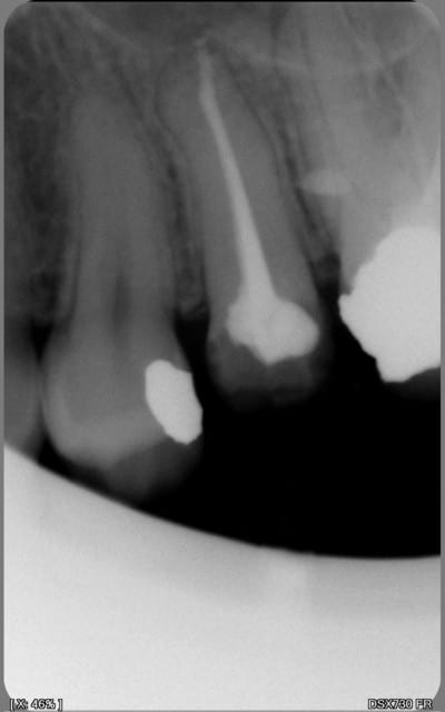 les dernieres radios. patient en urgence ,abces... il voulait pas extraire la dent. j'ai lui bien explque et il a choisi de essayer de garder la dent. retrait,pas d'isolation avec la digue donc pas de tenon fibree,amalgam et screw post.traitement fait il ya 2 ans je crois.patient fidel de cabinet maintenent.