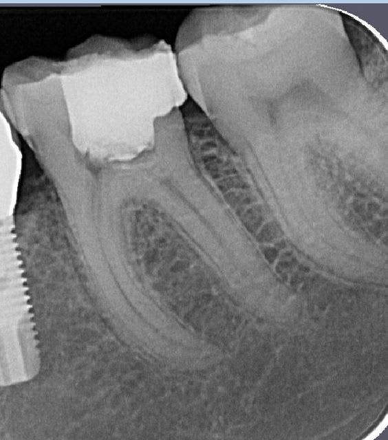 Mais il y a fort à parier au regard de la courbure importante de la racine mésiale qu'il faudra élargir cette chambre en mésiale, à ceci s'ajoute une carie débutante toujours en mésiale (sans parler des caries multiples un peu partout), donc on se dirige à mon avis vers de la prothèse périphérique.