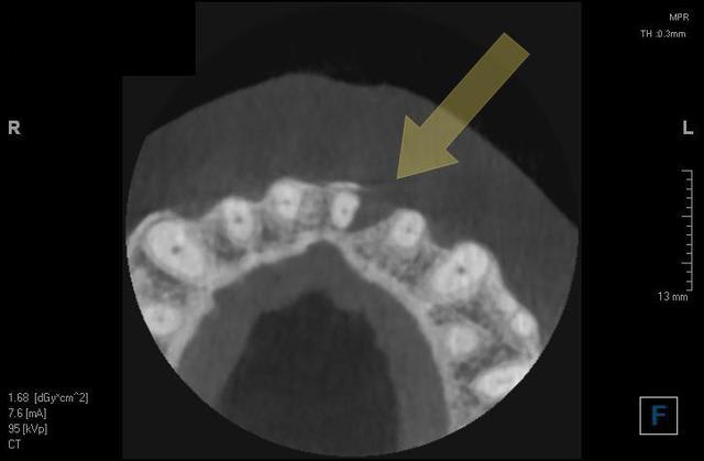 voilà un cas avec du metal:couronnes sur les dents bordant l'édentement, et en haut. c'est sur la reconstruction 3d que ça perturbe le plus. Cela dit, tu peux "couper" les artefacts pour les faire disparaitre, si tu souhaites une belle image en volume.