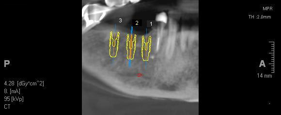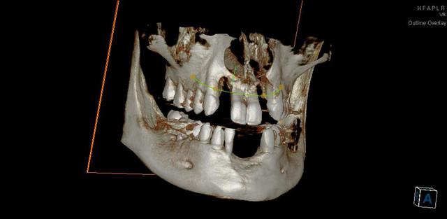 voilà un cas avec du metal:couronnes sur les dents bordant l'édentement, et en haut. c'est sur la reconstruction 3d que ça perturbe le plus. Cela dit, tu peux "couper" les artefacts pour les faire disparaitre, si tu souhaites une belle image en volume.