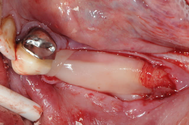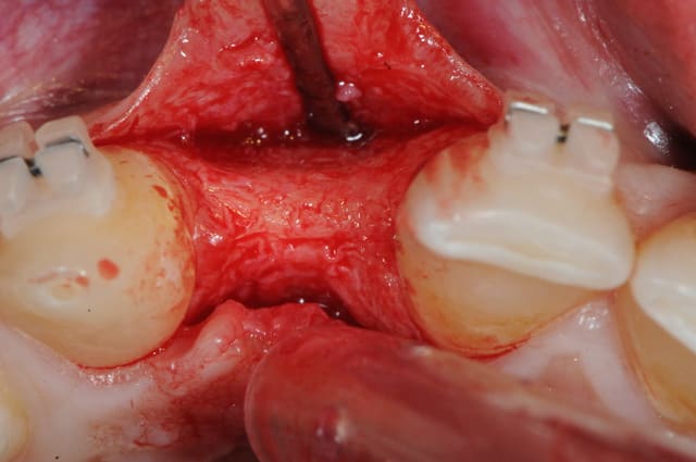 On y est déjà habitué qd on pose des disk puisque on est en full flap et qu il est nécessaire de poser un biomat sur les disk en vestibulaire pour prendre une distance biologique par rapport au lambeau et pour recréer un volume supplémentaire...