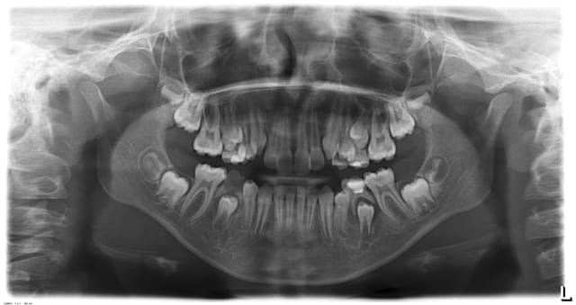 Le cas de conscience: la même orthodontiste veut baguer le petit frère de ma patiente. Son hygiène est aussi nulle que celle de sa soeur. Il a 9 ans. Je vous met la pano du frangin. Le problème d'encombrement (peu important) ne me parait vraimenet pas primordial au vue des risques carieux