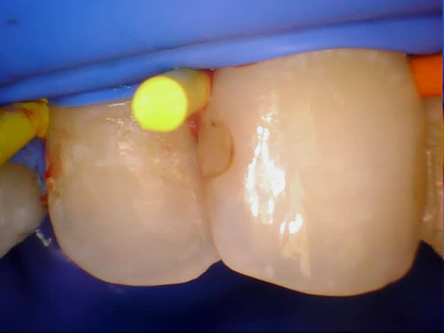 Le montage demande de fixer une zone blanche avec des écarts de teinte et de volume faible, j'y vois mieux à tête reposée plus tard, cela permet aussi de valider la teinte sur un support dentaire non déshydraté .