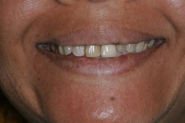 L'idée ici est d'améliorer un sourire et de motiver la patiente à un traitement ultérieur de bonne qualité, elle n'a pas de moyen pour l'instant de reprendre la 21, qui présente une face vestibulaire plate, un manque de soutient de la gencive, et une adaptation radiculaire médiocre, cependant c'est cette 21 qui devient pour l'instant l'élément de référence pour le montage composite, et avec cette vision là, la forme de 11 et 12 est en harmonie (voir même presque trop volumineuse) avec la 21.