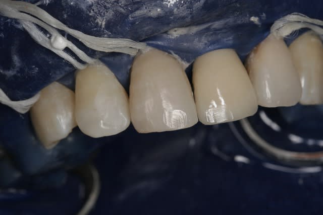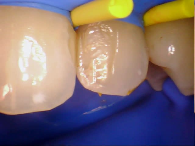 Le montage demande de fixer une zone blanche avec des écarts de teinte et de volume faible, j'y vois mieux à tête reposée plus tard, cela permet aussi de valider la teinte sur un support dentaire non déshydraté .
