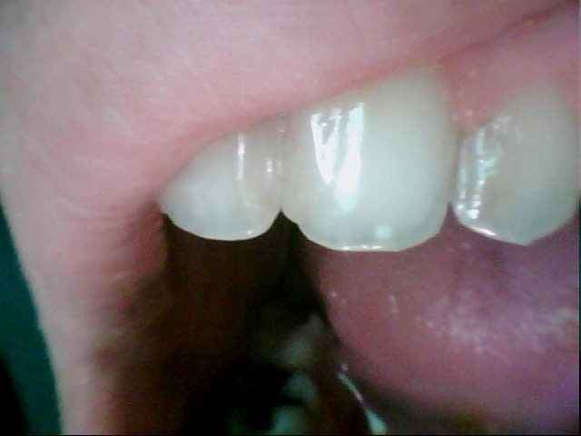 L'idée ici est d'améliorer un sourire et de motiver la patiente à un traitement ultérieur de bonne qualité, elle n'a pas de moyen pour l'instant de reprendre la 21, qui présente une face vestibulaire plate, un manque de soutient de la gencive, et une adaptation radiculaire médiocre, cependant c'est cette 21 qui devient pour l'instant l'élément de référence pour le montage composite, et avec cette vision là, la forme de 11 et 12 est en harmonie (voir même presque trop volumineuse) avec la 21.