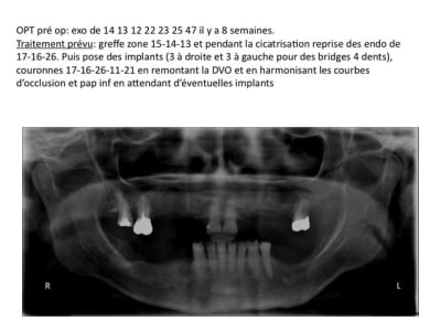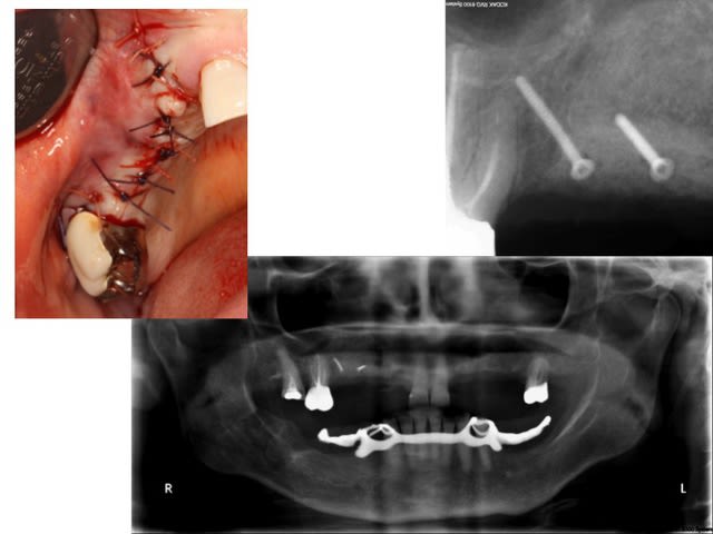 La deuxième est l'immobilisation parfaite des languettes de corticales qui vont servir d'exosquelette a ta construction. Tu as utilisé 2 vis dont une sert a la fixation de la languette palatine en transfixant la vestibulaire. L'ensemble de ta boite n'est en fait ancré que par la vis distale. Il ne me semble pas voir un decoupage particulier de ta languette vestibulaire qui viendrait en butée contre le rempart anterieur de ton defaut osseux et empechant une quelconque rotation de la boite ... Mais j'ai peut-être mal vu. Bref quel est ton avis sur ce point ?