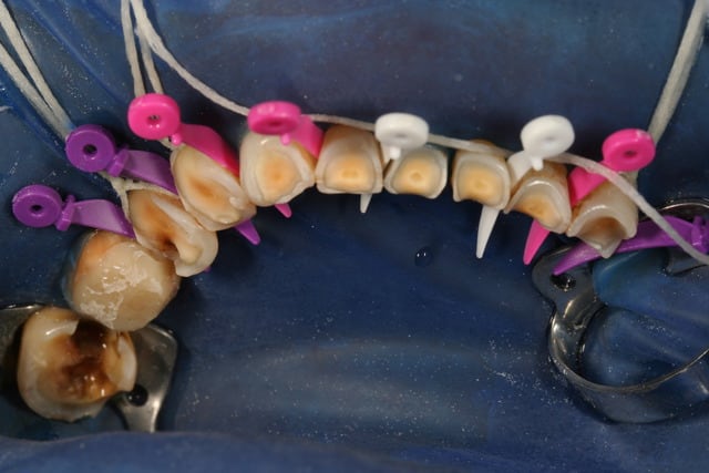 clef en silicone veut dire collage sans digue je suppose d'une part, et d'autre part il va falloir enlever tout les provisoires pour la suite, donc puisque c'est collé tout découper sans abimer la dent en dessous sur toutes les dents ...