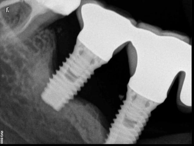 Le jour de la mise en place je pense avoir trop forcé sur l'os lors du vissage peut être par un sous forage lié à la position de la 47 (faible ouverture + langue bien présente) J'y voyais pas grand chose et je pense, et j'ai eu tord,que j'étais pressé d'en finir.