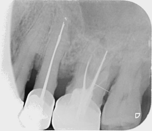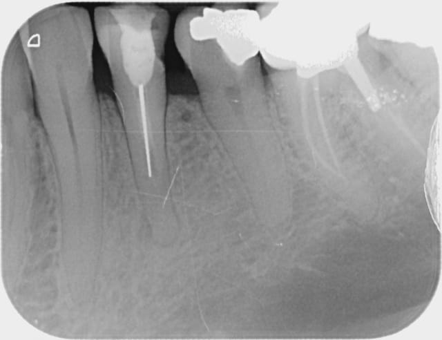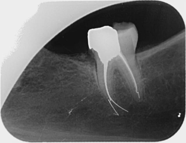 > compte qu'une endo obturée à 15 mm de l'apex mais sans lésion radiologiquement