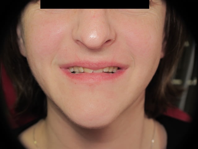 Patiente de 33 ans, questionnaire de santé RAS, demande esthétique. Elle souhaiterait que ses dents soient "davantage visibles" lors du sourire. Les dents absentes sont dues à des agénésies.