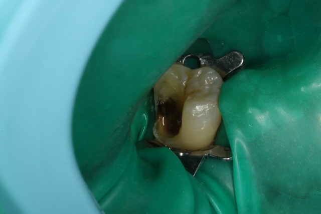 La cavité d'accès pour une dévit est insuffisante , la dent est vivante . La limite de la cavité est sus gingivale .