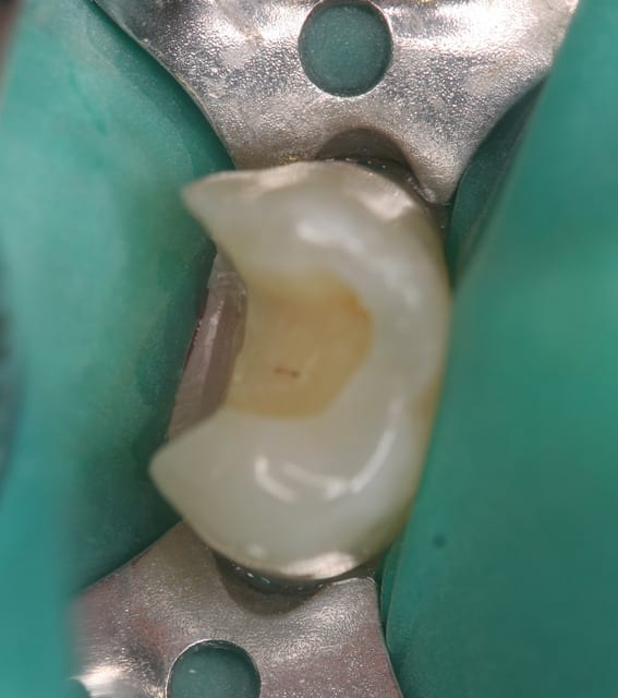Dent vitale. Il y avait un compo OD et le pan V a lâcher. Limite supra-gingivale.