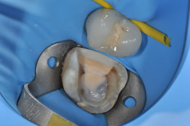 J'isole toujours avec la digue, en ne laissant dehors QUE la dent qui va recevoir l'onlay. Avant de me lancer, je pensais betement que l'épaisseur de la digue allait empêcher la bonne assise de la restoration ; pas du tout. Clampe la dent préparée uniquement, la digue isole impeccablement les autres dents et on s'épargne de longues minutes de galère. De plus, la digue fait un peu "matrice" en étant placée ainsi, et il m'arrive que des excès inter-proximaux soient parfois encore un peu visibles à la radio et pourtant à peine sensible avec le fil dentaire. Je ne dis pas que c'est bien de laisser des excès de colle, mais juste que clamper ainsi évite, ou du moins minore, le gros excès bien pointu qui gâche tout...
