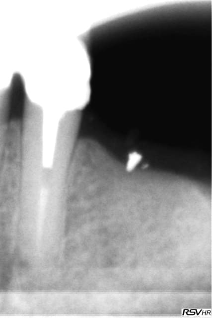 sinon le deuxième site, moi, me paraît louche...c'est pas du D4, j'aurais plutôt tendance à dire que c'est du tissu de granulation...( et peut être bien un petit morceau de racine...c'est pas très net...)