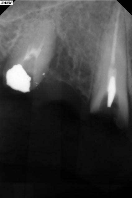 Dans les faits le bridges est venu sans aucune difficulté, par contre l'ancrage sur la 13 était un tenon fileté en or, une vraie saleté. Aucun résultat après 30 mn d'ultra son, ni avec la trousse de Gonon. J'ai fini par tirer dessus, dans l'axe de la racine avec une pince hémostatique, il s'est cassé et j'ai dû fraiser pour retirer le dernier fragment ...