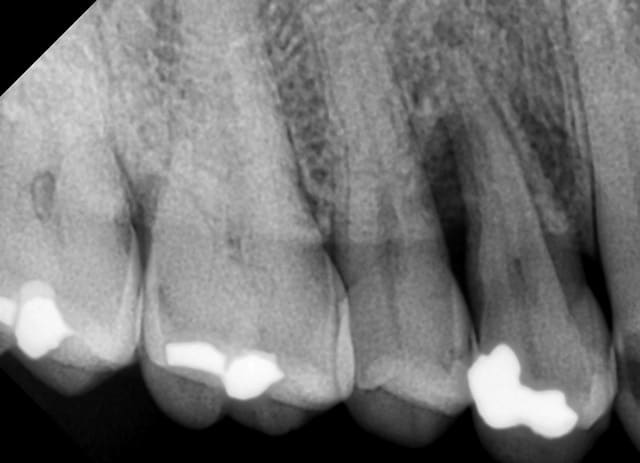 Aujourd'hui, il va perdre sa 14 avec une jolie perte osseuse. Le reste de la bouche est ok, pas de problème ni d'hygiène ni d'occlusion, 15 et 13 sont saines (sauf une carie en distal de 13).
