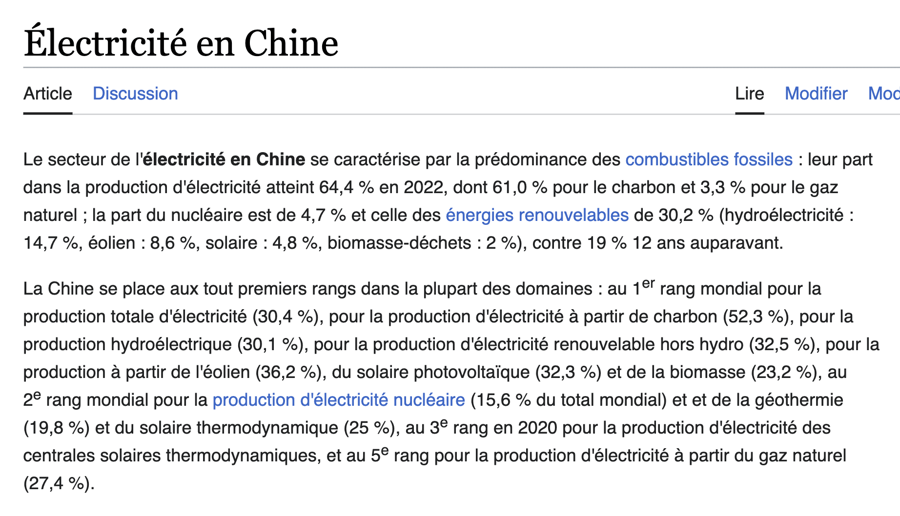 "La production d’électricité est responsable en 2022 d’environ 40 % des émissions mondiales de CO2. Dans ces émissions dues à l’électricité, 73 % proviennent des centrales à charbon, et 22 % des centrales à gaz.