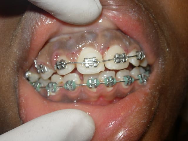 Tout à fait d'accord pour la ligature, elle va partir en gingival et çà sera impossible à déposer sans anesthésie et sans faire souffrir ce gamin qui est déjà traumatisé(larmes sur les joues) c'est tellement plus simple, plus logique et plus efficace de mettre un arc sur ces brackets qui jouera le rôle de contention et qui sera facile à déposer.