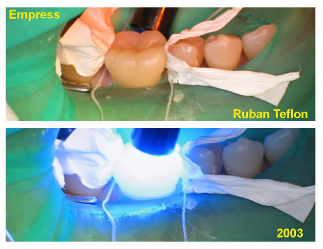 Les deux avantages du ruban de teflon foulé dans le puit d'accès est d'une part pouvoir fraiser à travers la couronne avec une fraise diamantée sans risquer d'accrocher une boulette de coton ( toujours aussi surprenant pour le patient et l'opérateur )et d'autre part le ruban de teflon bien compacté empêche le ciment de scellement de s'infiltrer dans la tête de la vis ce qui peut arriver si le coton est déplacé et soulevé lors du scellement.