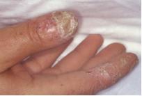 La biopsie cutanée de l’ulcération de l’index droit met en évidence un carcinome épidermoide très bien différencié.