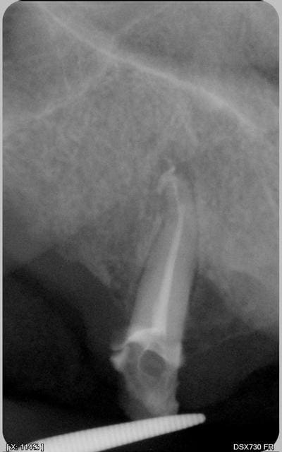 > Ici, le praticien a certainement été obligé d'enlever le crampon pour faire son cliché post-endo