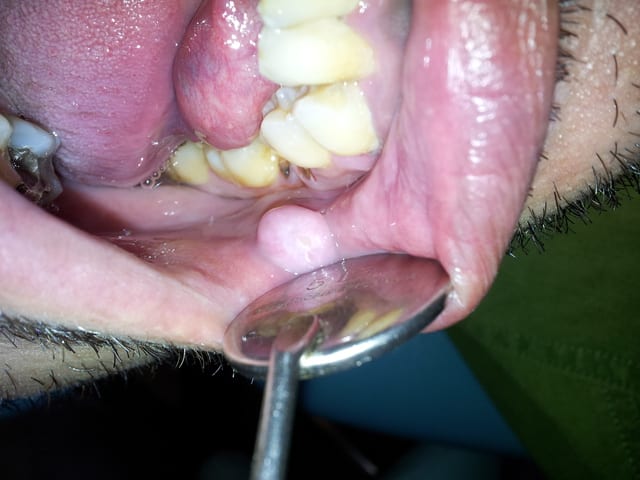 Patiente la 40aine, gros fumeur, alcoolisation quotidienne, Hygiène inexistante se présente avec une "boule". Apparition il y a un an et qui a grossi.. D’après lui, c'est du a un tic de mordillement et a l'irritation qu'as provoquer les épines des racines résiduels de la 46.